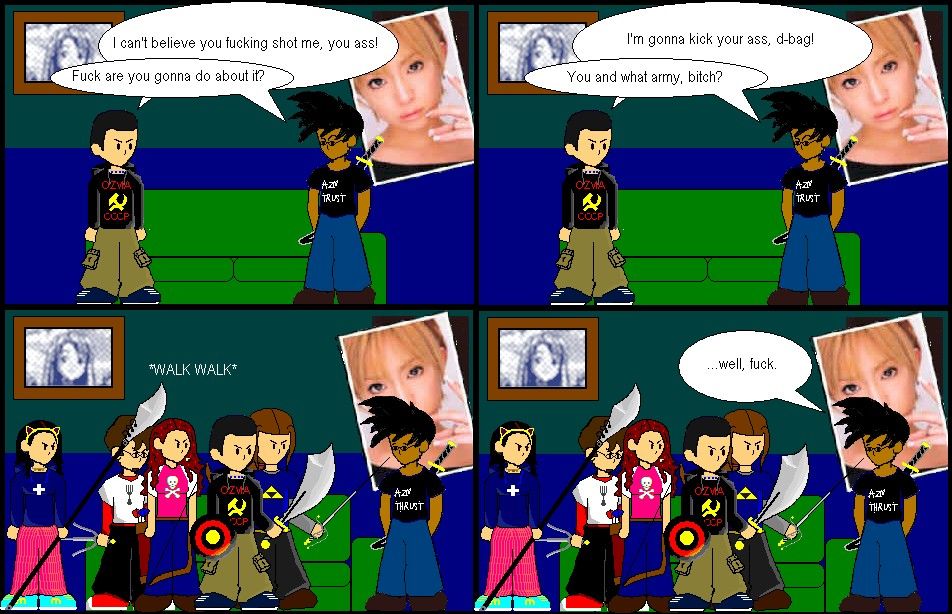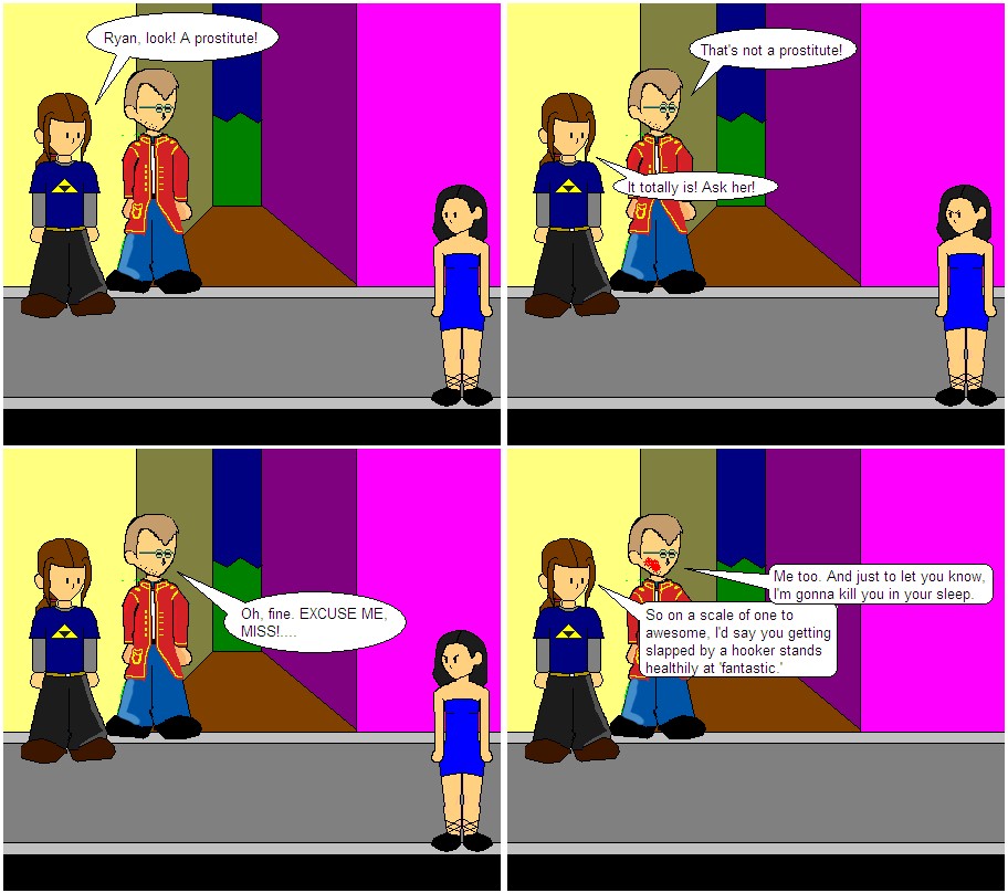 Then we get two peripheral characters battling it out. If you don’t know who three of them are, that makes sense. The fact that I don’t remember who one of them is, that makes it weird. The *azn thrust* Harvest guy is a representation of a dude-bro that Harvest was very close with, and he was a real homophobe. The guy in the white shirt is a redrawing of Fetus from a previous strip. The girl with the cat ears… who is that? I don’t know!
